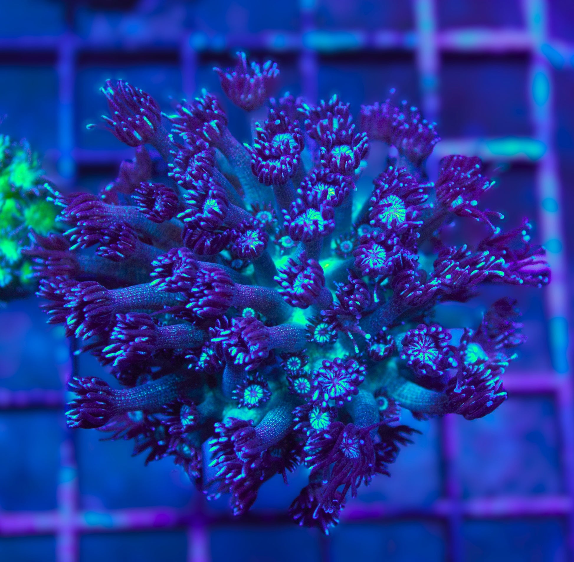 This dazzling Goniopora showcases vibrant deep purple tentacles tipped with shimmering neon highlights, creating a glitter-like sparkle under reef lighting. Each polyp extends gracefully, swaying with movement to add flow and life to your aquarium. A true showpiece, the Purple Glitter Goni is perfect for reef keepers looking for a centerpiece coral with both bold color and mesmerizing motion.
